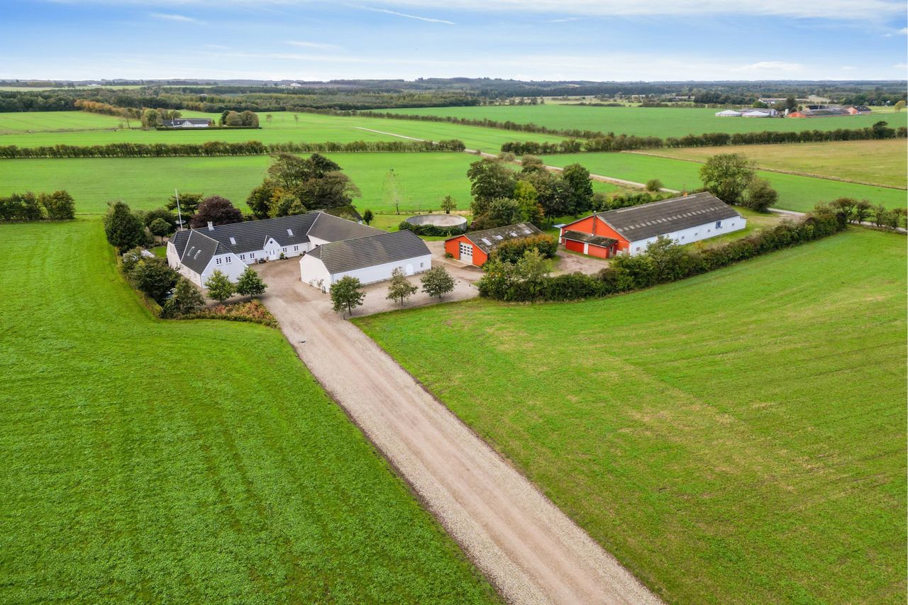 Bygningerne består af flot stuehus, totalrenoveret og delvis nybygget i 2007/2008, garage og staldbygning