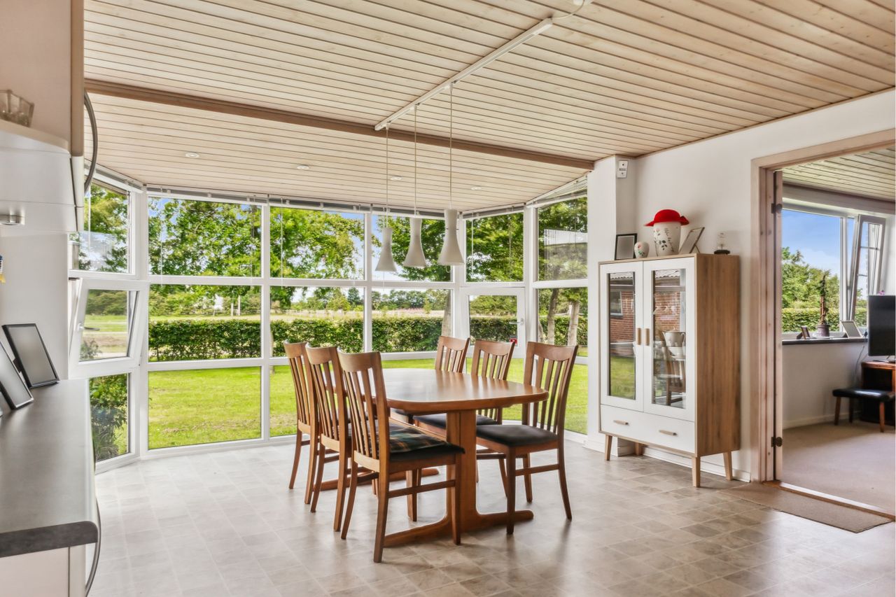 Der er en god beplantning mod vejen, og mod vest er der have og udsyn til marken.