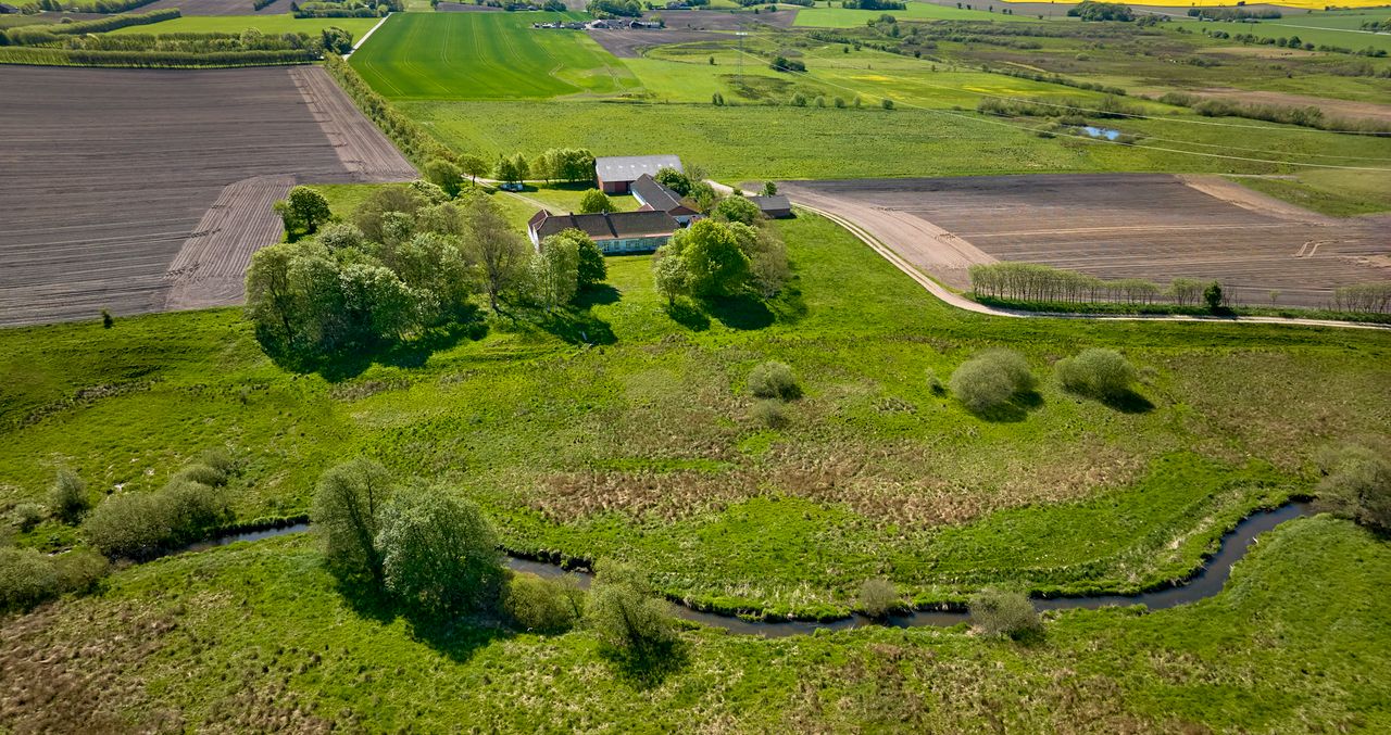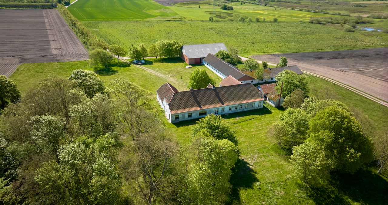 Ejendommen består er hovedbygning i 3 længer, ældre driftsbygninger og et matrikulært areal på 3ha.