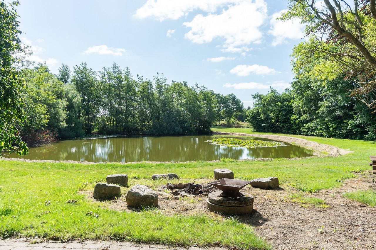 Den flotte have prydes af smuk beplantning omgivet af høje, skærmende træer samt en hyggelige sydvestvendt terrasse.På det medfølgende areal ligger der en stor sø indhyllet i store træer. Hertil en lille hytte med bålplads.