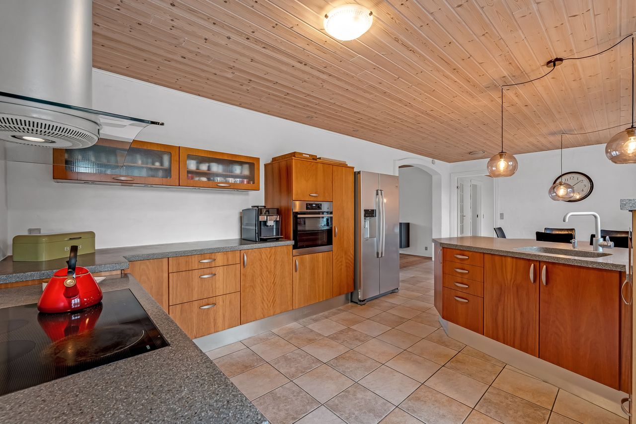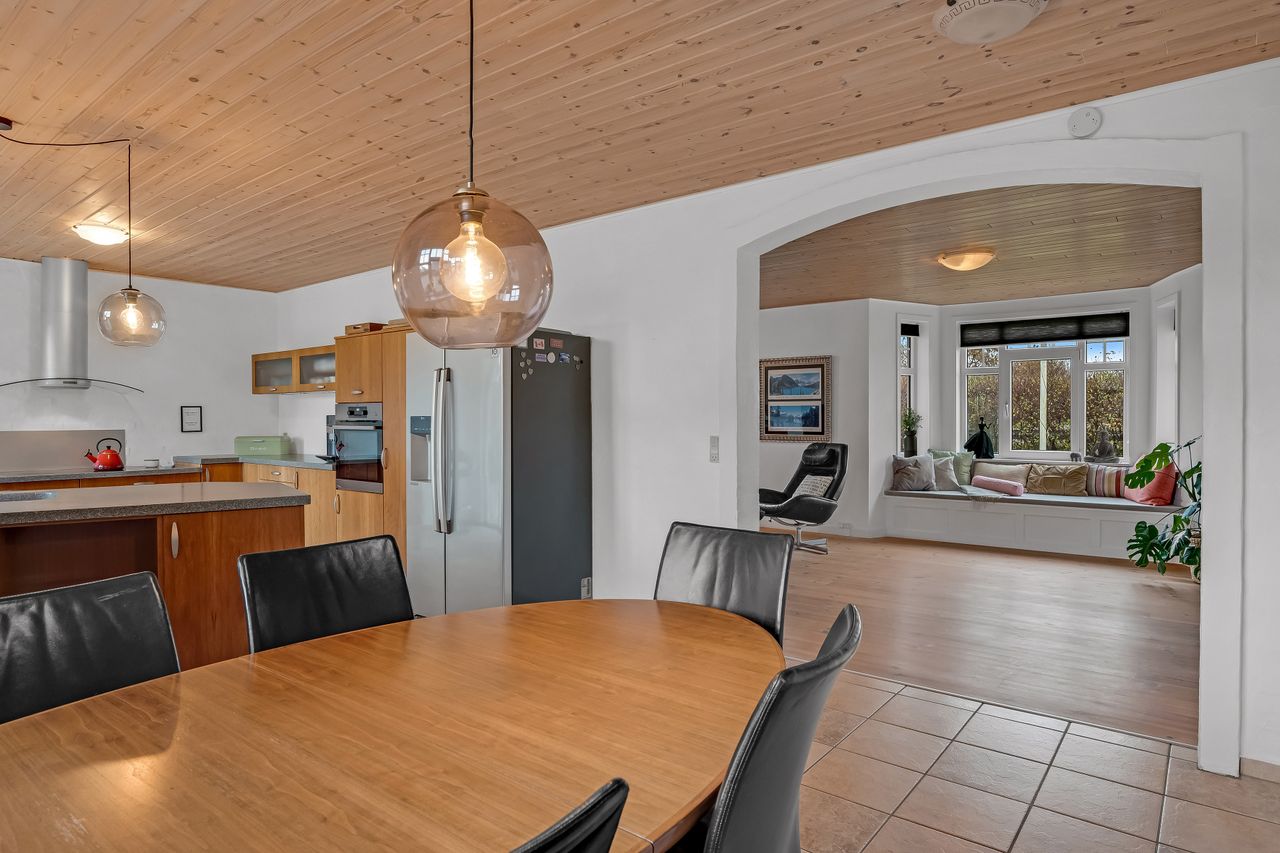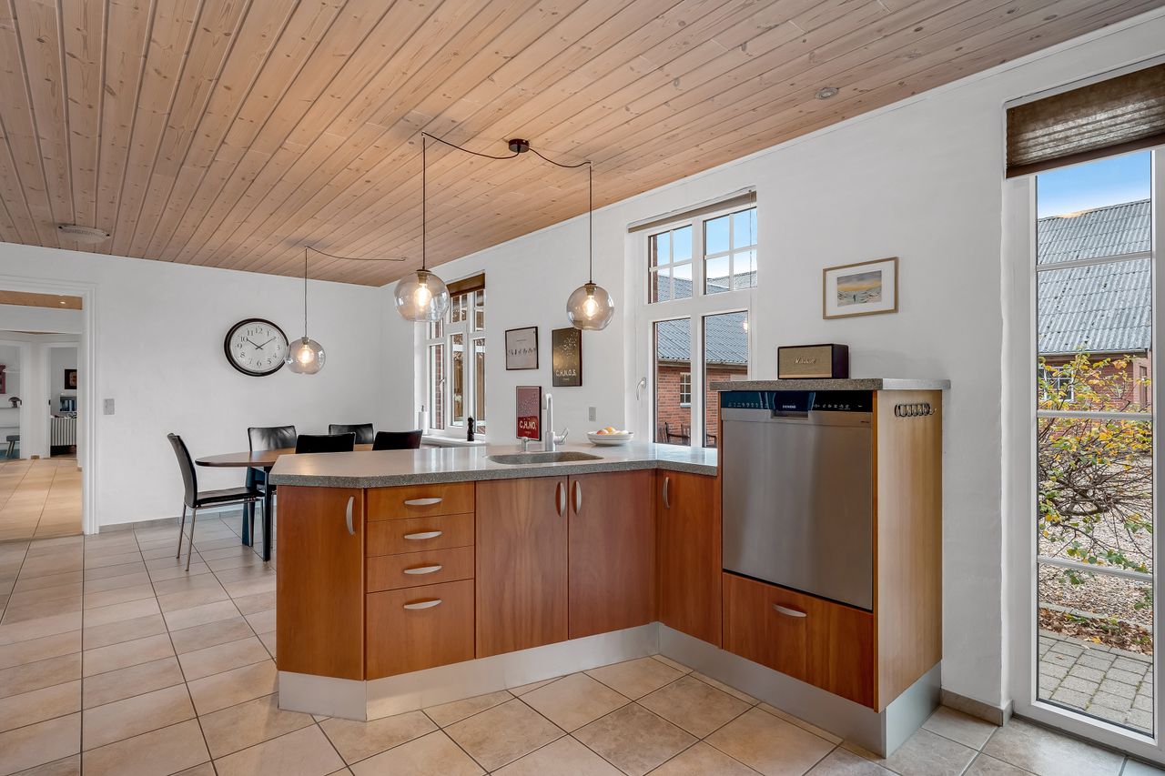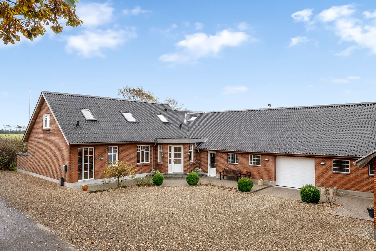 Stuehuset, opført i røde sten med eternittag og termovinduer fra hhv. ca. 1994 og 2004, byder på hele 226 m² velfordelte kvadratmeter. I stueplan finder du entré med klinkegulv og gulvvarme samt trappe til 1. sal. Køkkenet har klinkegulv med gulvvarme, Invitakøkken fra 2004 og bordplade i kunstmarmor. Den store stue har trægulv med gulvvarme, udgang til terrasse og en hyggelig karnap med indbygget sofa. Derudover rummer etagen et soveværelse med skabsvæg, et badeværelse med loft til kip, dobbeltbruser og to håndvaske, et værelse samt endnu et stort værelse og et kontor/værelse – flere med gulvvarme.