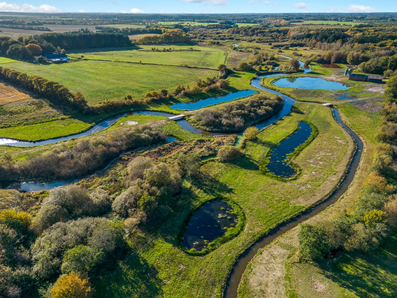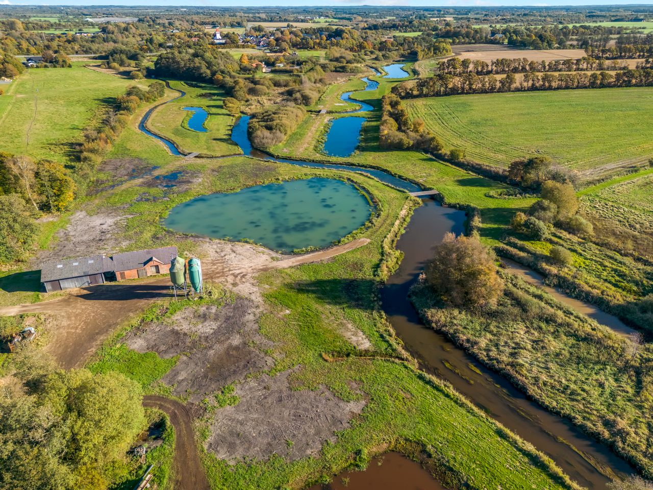 De tidligere dambrugsarealer er omdannet til søer, snoede åløb og naturlige eng- og vådområder, hvilket skaber en unik ejendom med et rigt dyreliv og en helt særlig stemning.