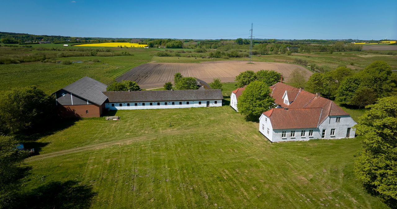 Ejendommen består er hovedbygning i 3 længer, ældre driftsbygninger og et matrikulært areal på 3ha.
