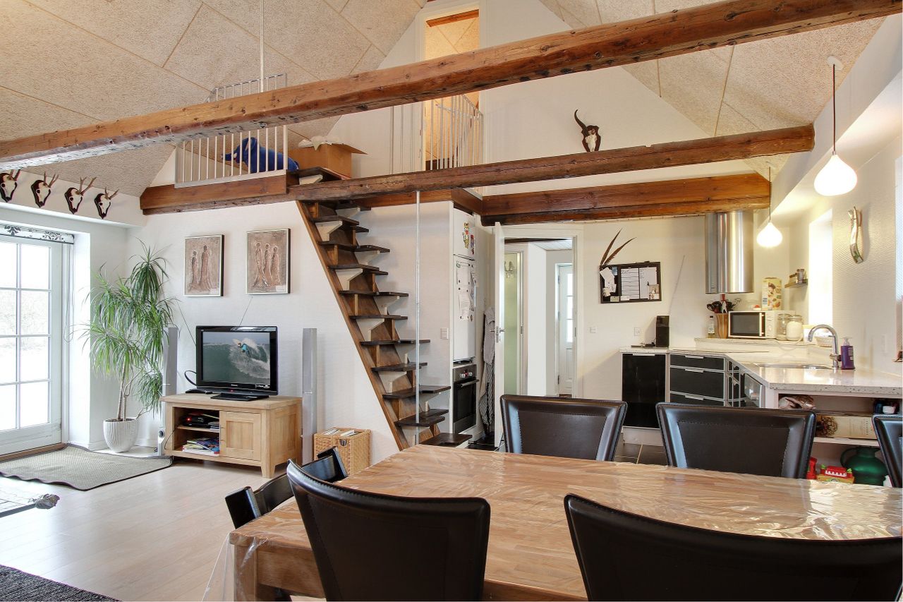 Fra husets eneste indgang går man direkte ind i køkken alrum og videre ind i stuen. Herfra er der udgang