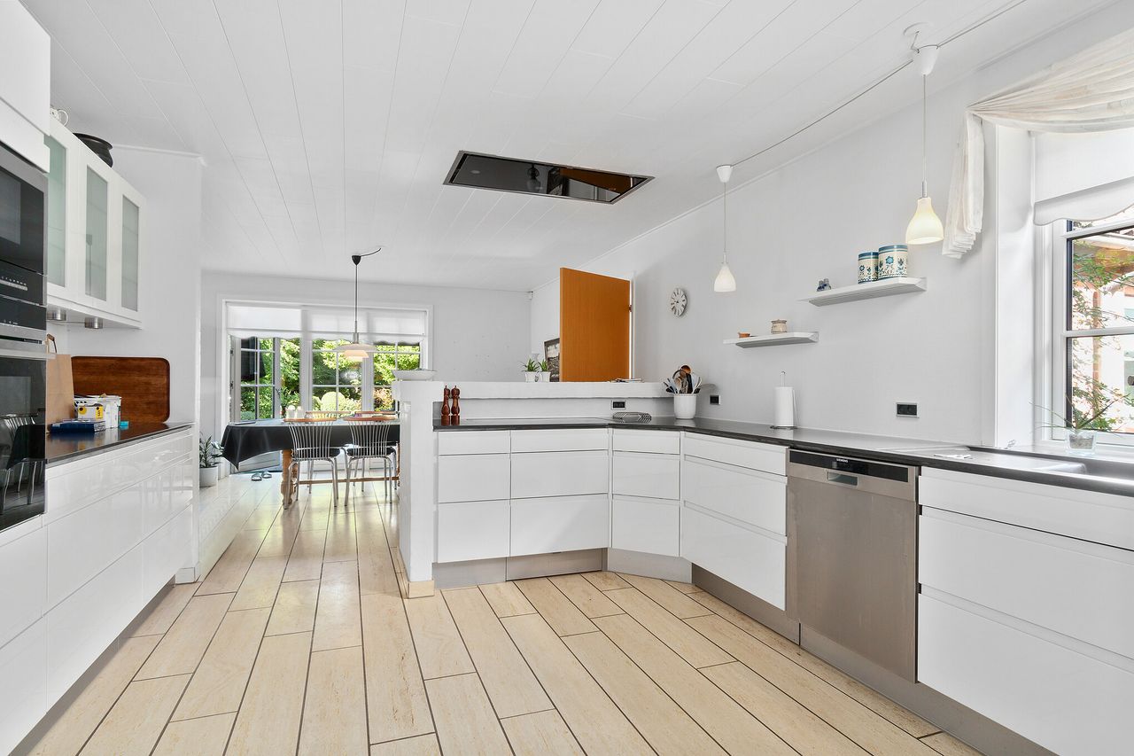 Boligen rummer hele 337 m2 og byder på en masse gode værelser, 2 stuer, et godt køkken-alrum med moderne elementer, 2 toiletter og et kæmpe badeværelse med spabad og sauna. Hertil kommer flere udbygninger samt en parklignende have.