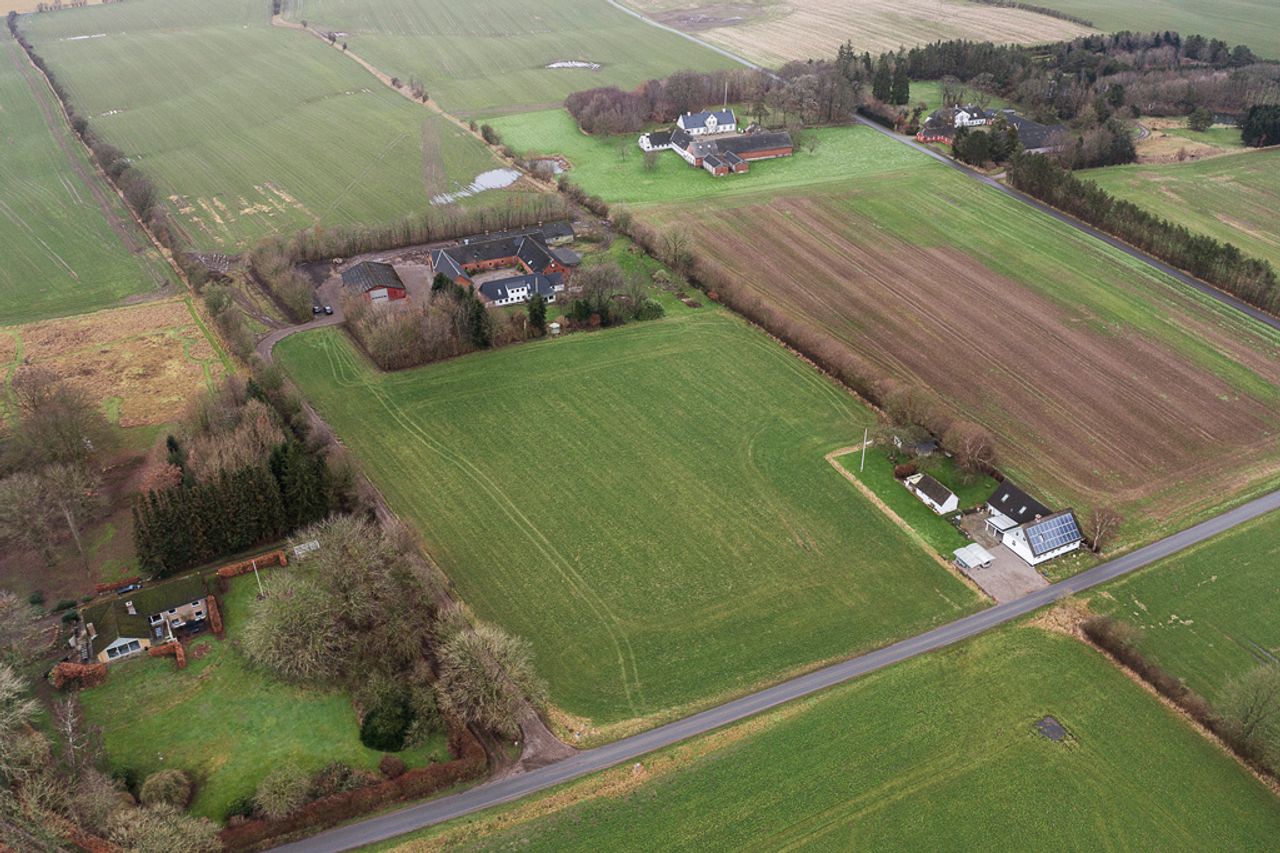 Til ejendommen medfølger et grundareal på ca. 2,6 ha, beliggende i et samlet stykke. Agerjorden udgør ca. 1,4 ha og resten er bygningsparcel. Der er mulighed for køb af yderligere ca. 2 ha ager og/eller 2,8 ha skov.